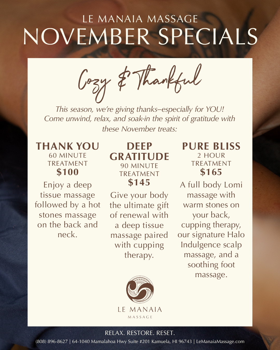 Now it’s time to embark on a new journey with Le Manaia, my very own business providing massage therapy in the comfort of your home. In the Samoan language, Le Manaia means “to be blessed”—I envision a business where everyone is treated as family; leaving you happy, relaxed and blessed by promoting healthy bodies and minds. By appointment, I provide house calls for services that include Swedish, Lomi Lomi, Deep Tissue, Sports Massage, Pōhaku Massage, and Cupping Therapy.