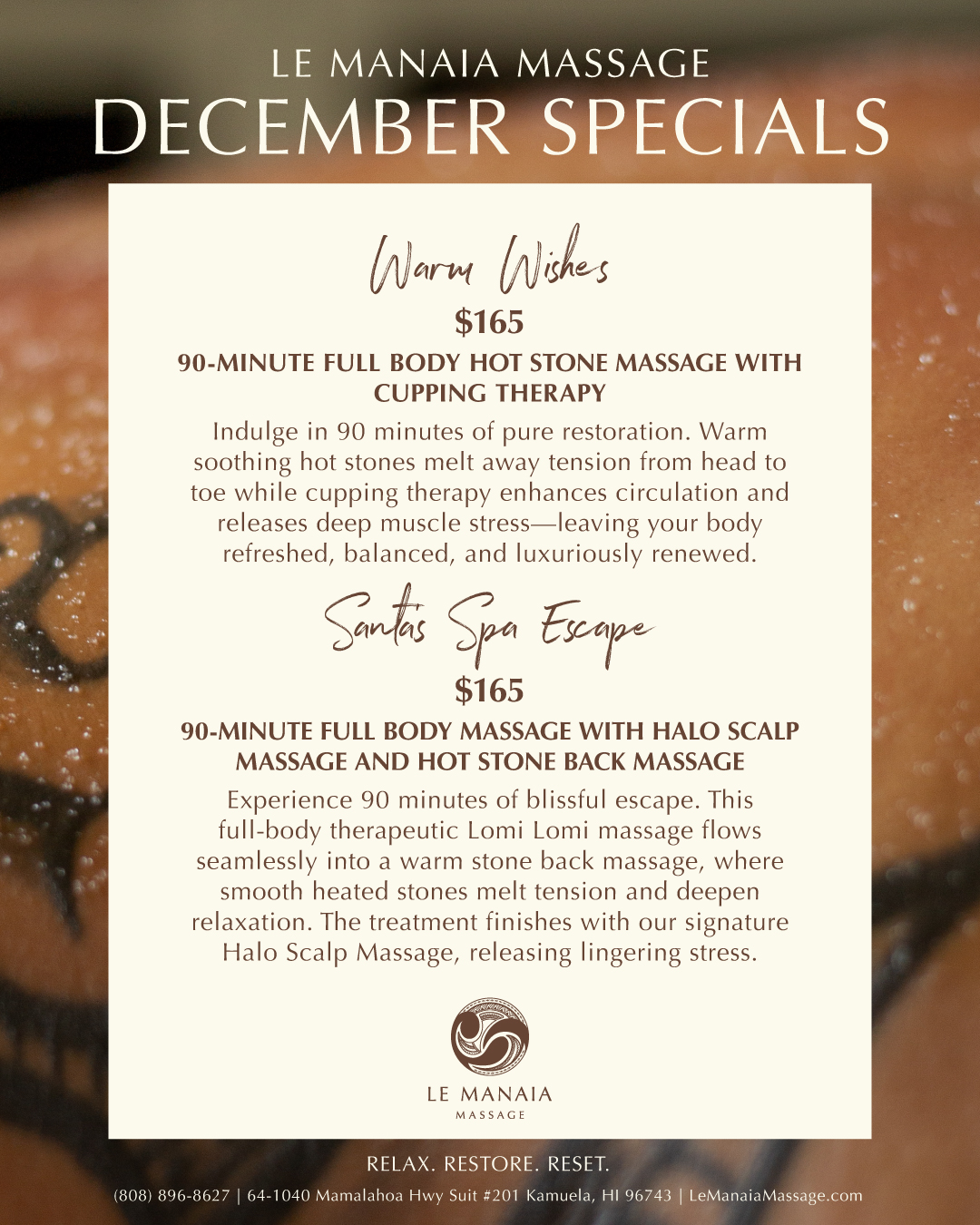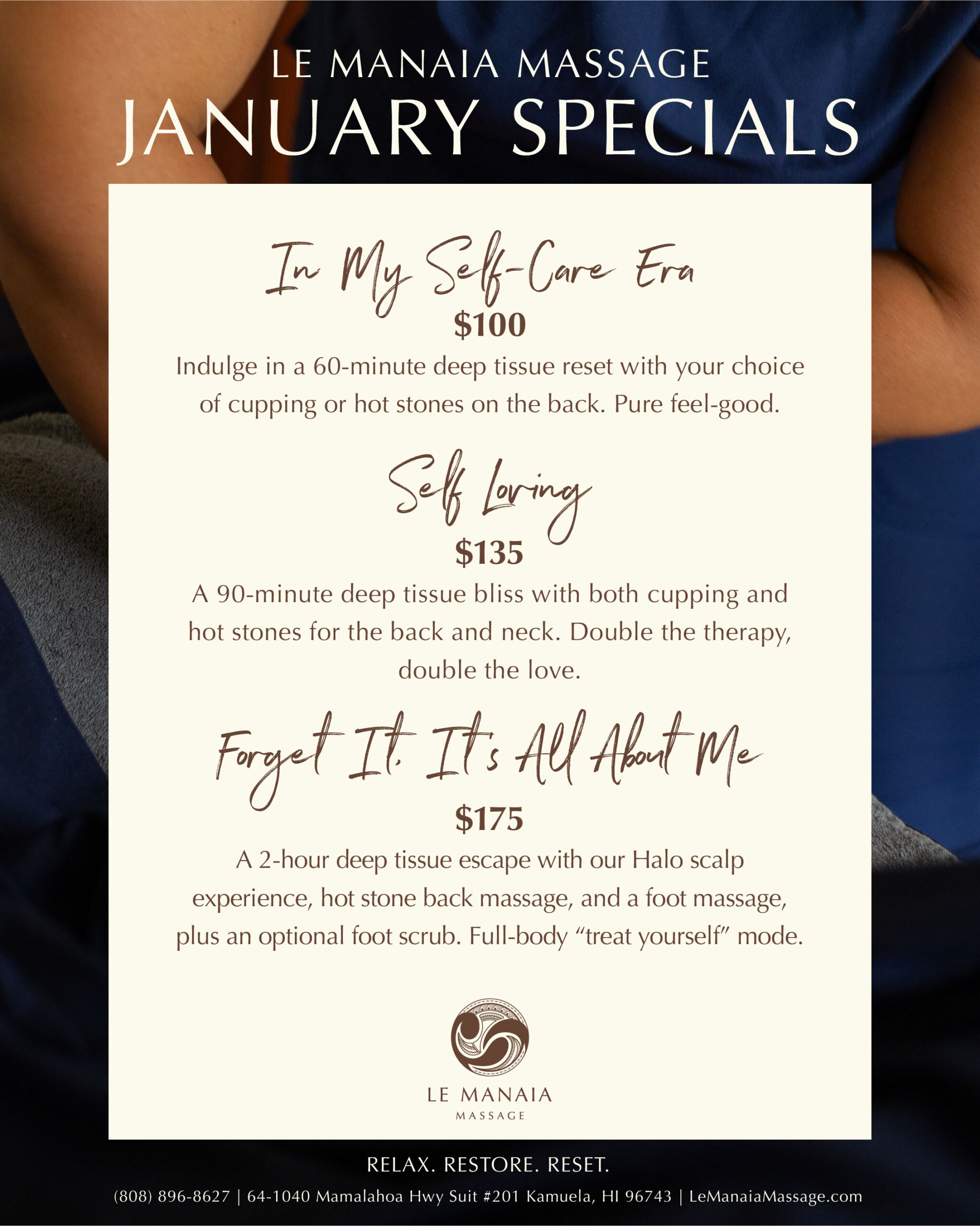 Now it’s time to embark on a new journey with Le Manaia, my very own business providing massage therapy in the comfort of your home. In the Samoan language, Le Manaia means “to be blessed”—I envision a business where everyone is treated as family; leaving you happy, relaxed and blessed by promoting healthy bodies and minds. By appointment, I provide house calls for services that include Swedish, Lomi Lomi, Deep Tissue, Sports Massage, Pōhaku Massage, and Cupping Therapy.