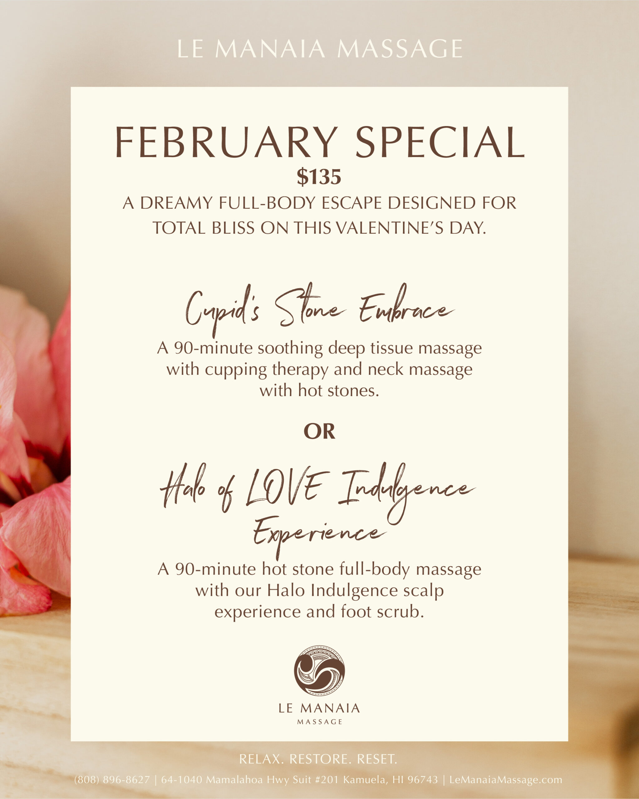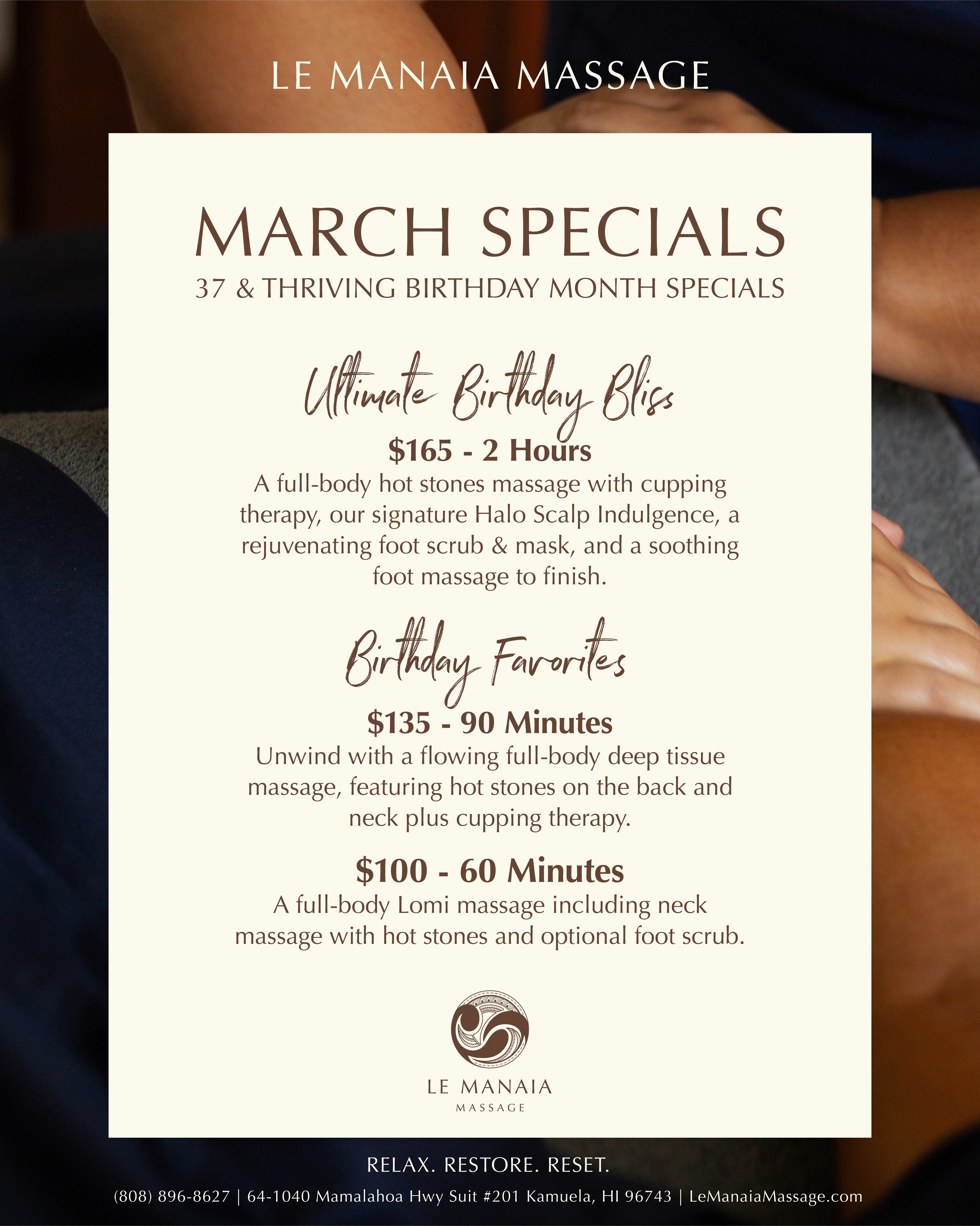 I started my journey into massage therapy back in 2016, inspired by my dad, who taught me what it means to give back and help others. I wanted to embrace this passion and after completing my education and training from Hokulani Massage Academy, I became a licensed massage therapist in 2017.