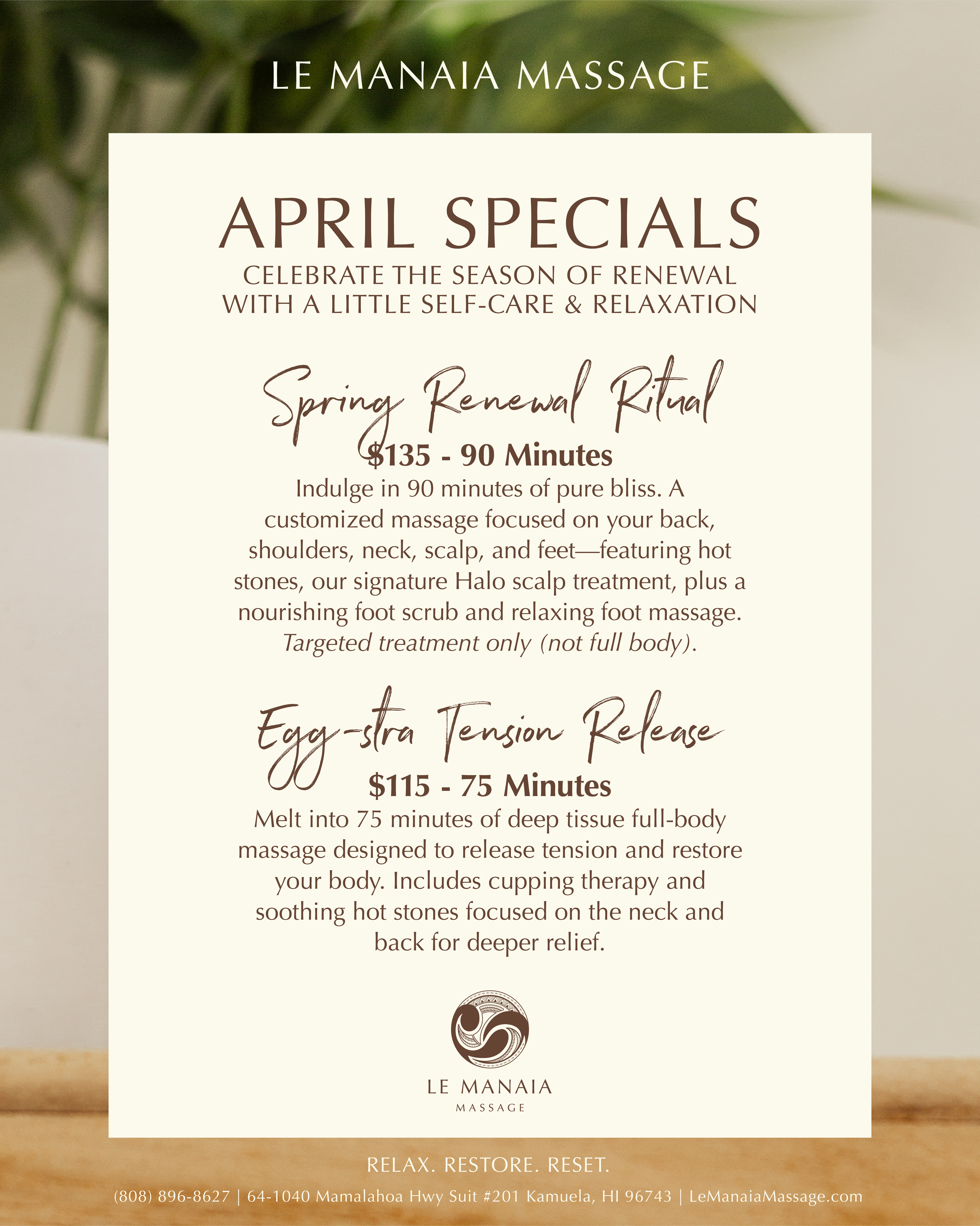 In addition to Le Manaia, my experience includes the Fairmont Orchid, Auberge Resort at Mauna Lani and Kohala Spa at Hilton Waikoloa Village where I am also employed as a therapist. I am eternally grateful for the opportunity to help and heal our community through massage and thank you for your trust and support. As embodied by the symbols of my logo, Le Manaia represents family, protection, and health—I look forward to visiting with you soon.
